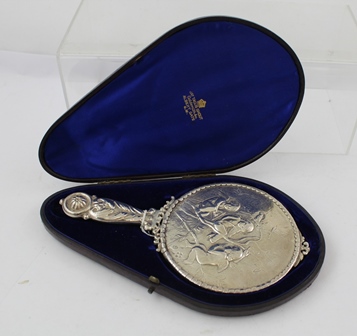 EDWARD BROWN A LATE VICTORIAN SILVER MOUNTED HAND VANITY MIRROR, repousse decorated with cherubs amidst the branches of a tree, London 1888 in original silk and velvet lined case, Jas Tagus Shout, Goldsmith & Co, Albert Gate, S W