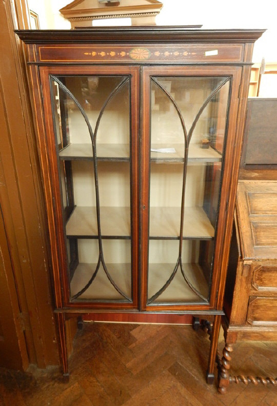 having raised ledge back, two shelves enclosed by pair astragal-glazed doors, all with oval fan patera and harebell marquetry inlay and with boxwood stringing, on square tapering supports and spade feet