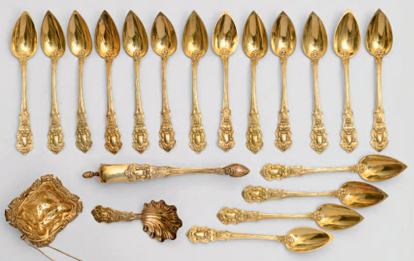 Eighteen teaspoons gilt shells and cartridges rock (a rugged) is appended a sugar tongs, a teaspoon jam and a tea strainer gilt