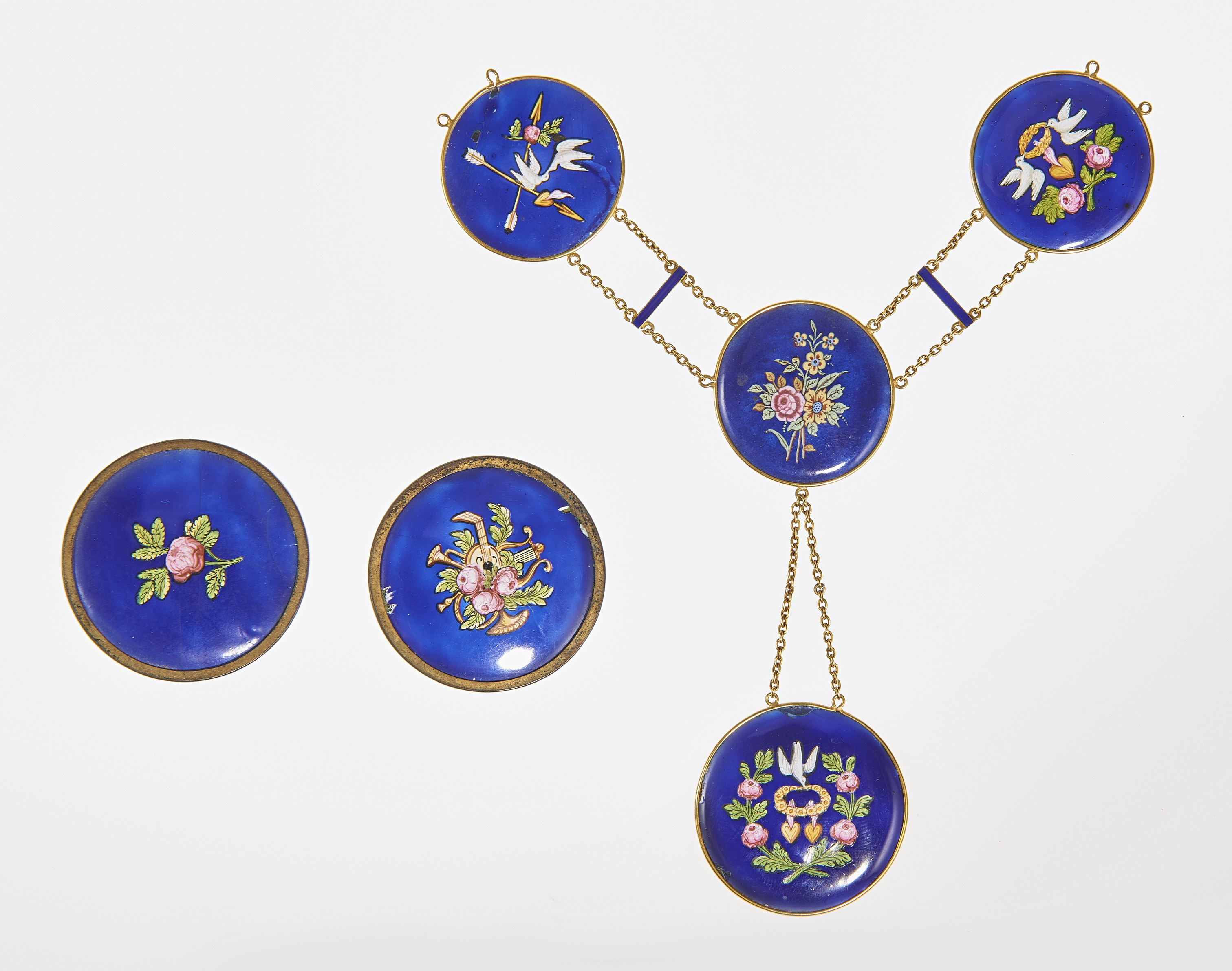 750 gold, gross weight 27 g. Two metal buttons are attached with painted enamels.