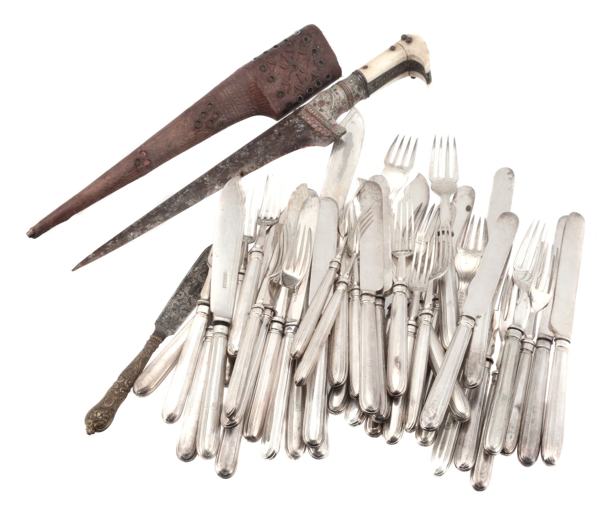 engraved with a crest and a motto Tu Vincula Frange , knife-type handles; four plated pairs en suite and six fish knives and four forks en suite; and an Afghan dagger (choora), with a bone hilt and leather cover sheath (rusted)