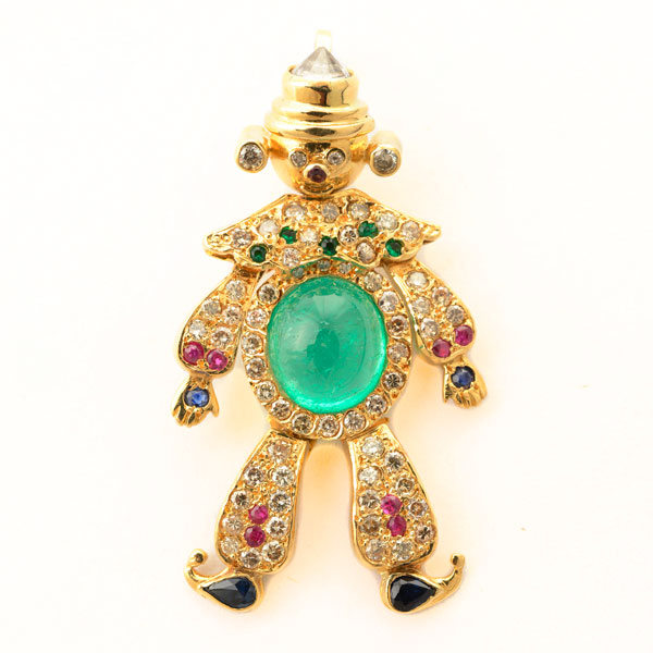 Emerald, Diamond, Ruby, Sapphire, Glass, 18k Yellow Gold Clown Pendant.