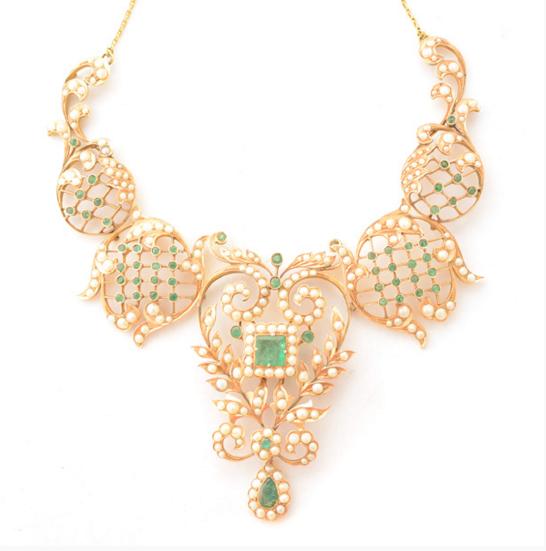 Emerald, Seed Pearl, 14k Yellow Gold Necklace