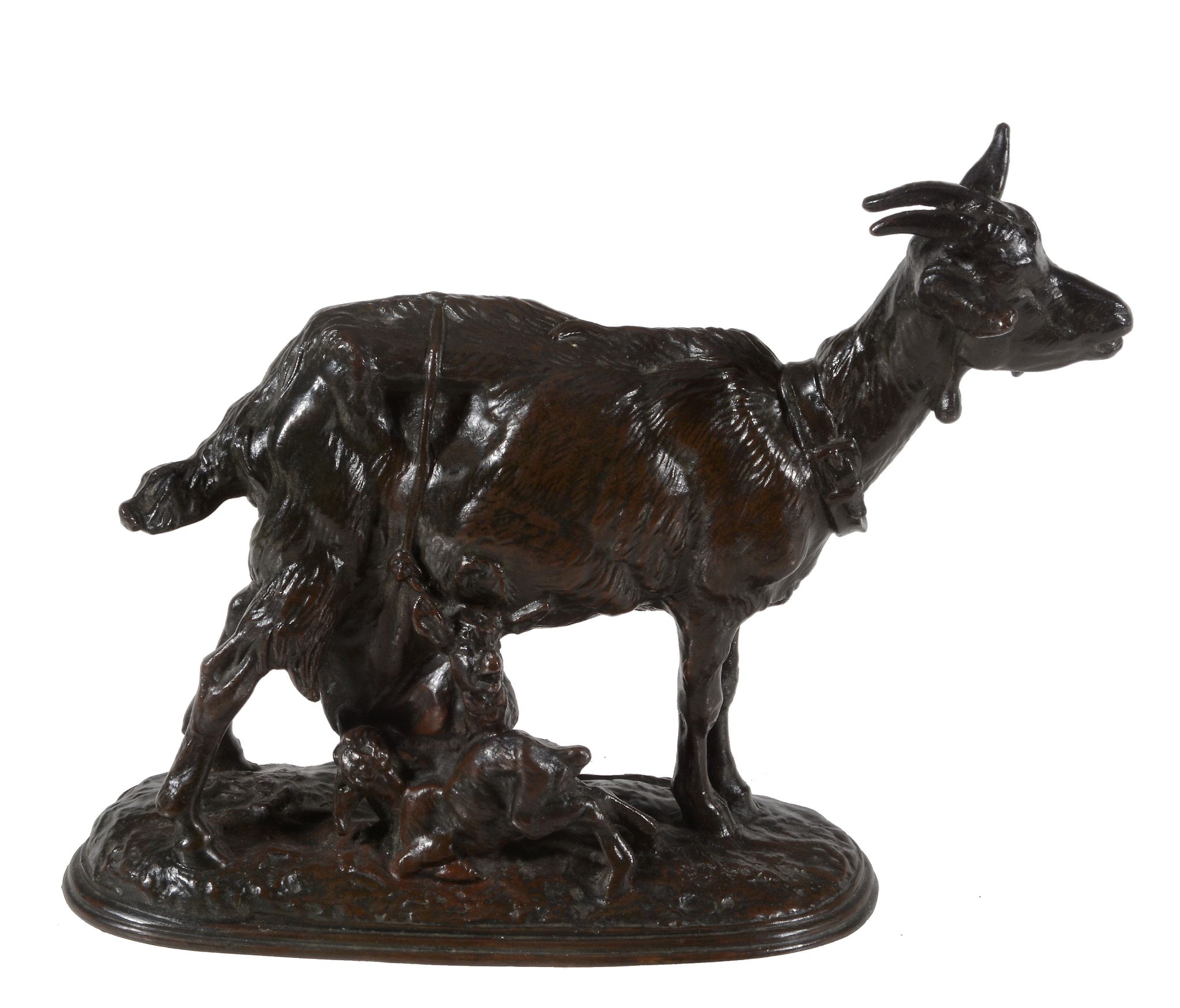 the kids beneath the standing goat, the naturalistically cast oval base stamped in the maquette 'E.FREMIET', 16.5cm high, 21cm long