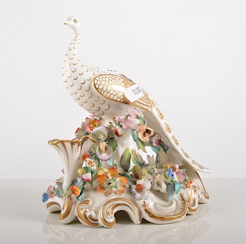 English porcelain model, Peacock, encrusted floral base
