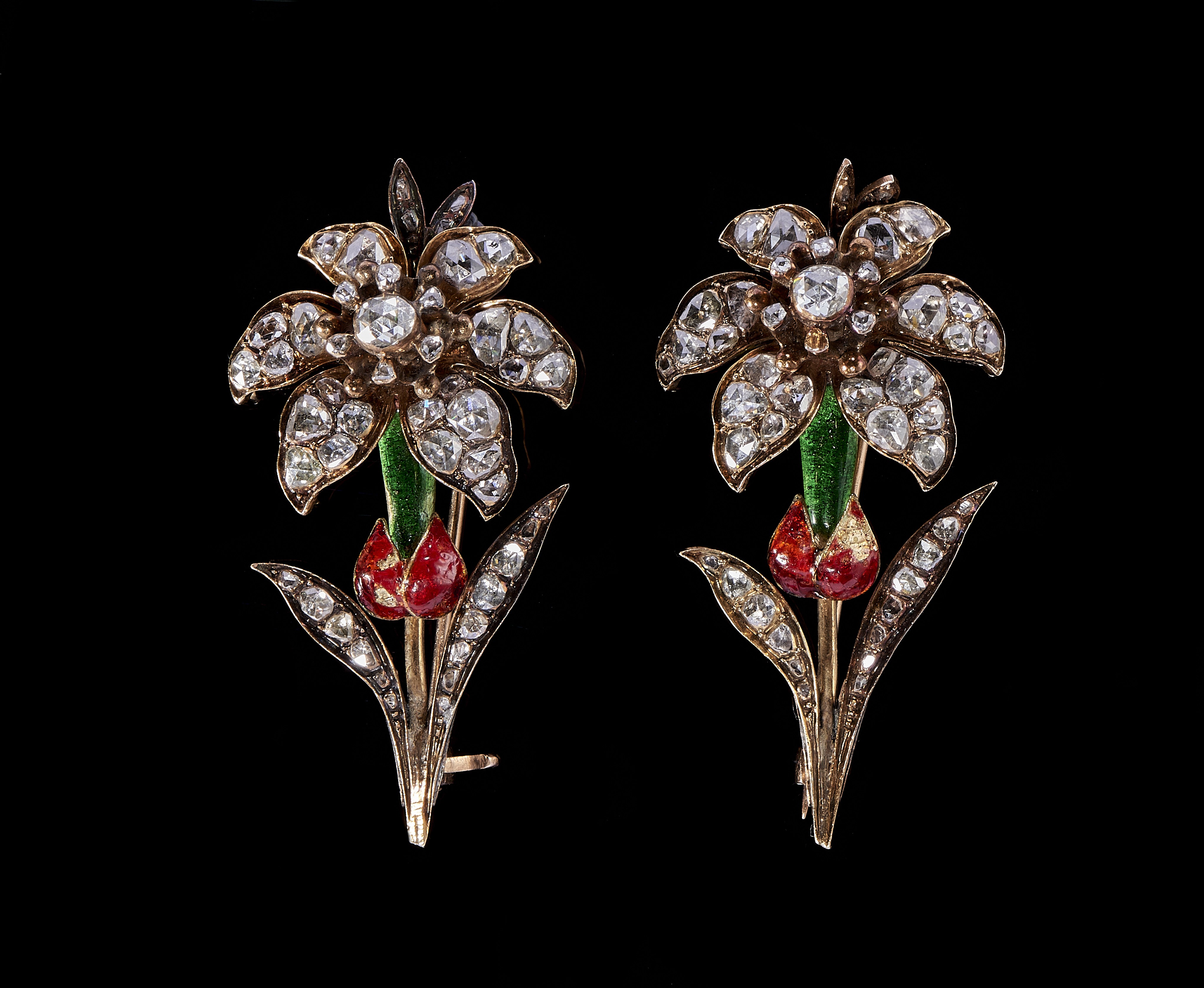 Ensemble de deux broches fleurs émaillées serties de roses de diamant