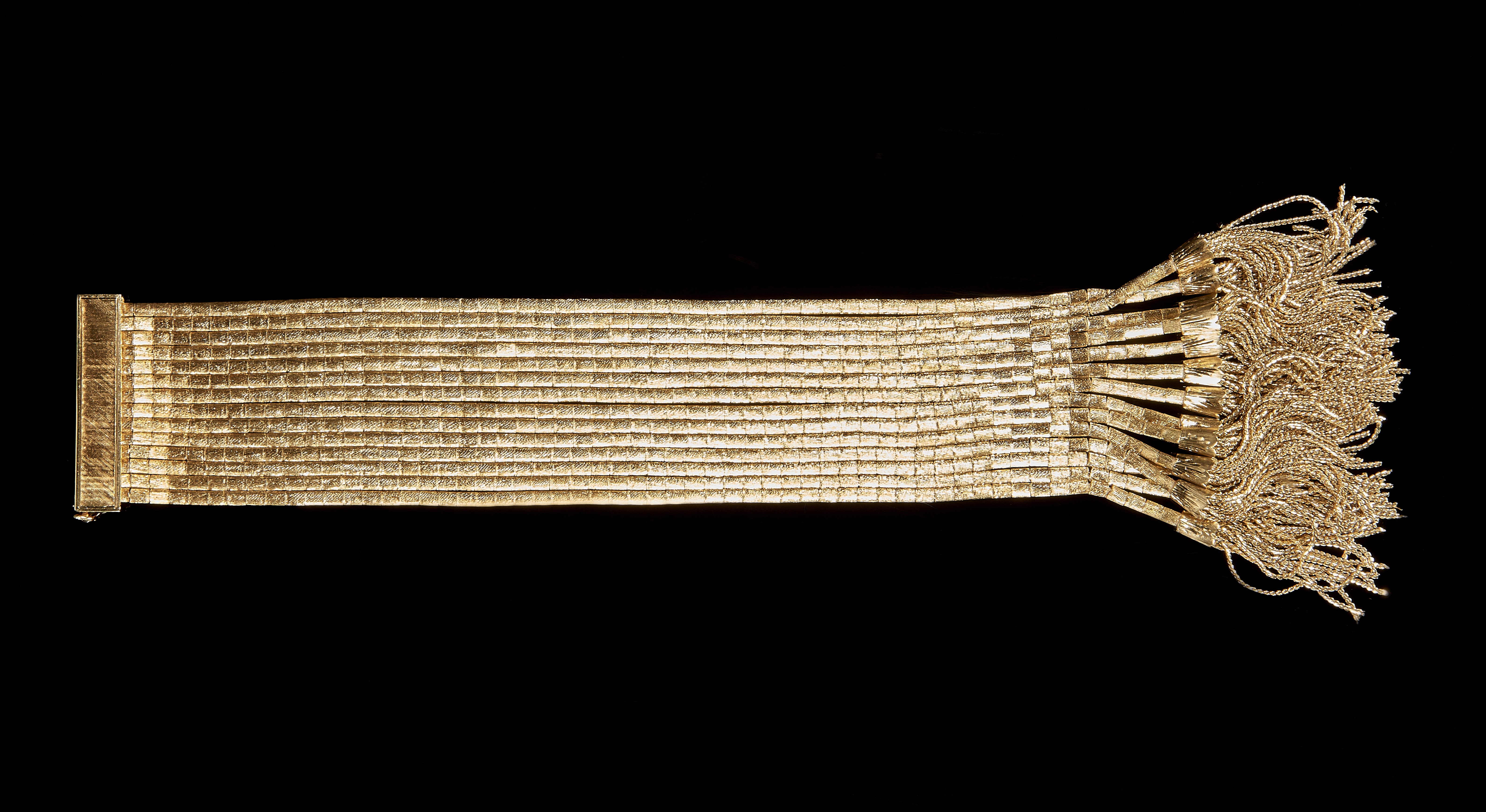 Flexible satin multi-row cuff bracelet finished with pompoms