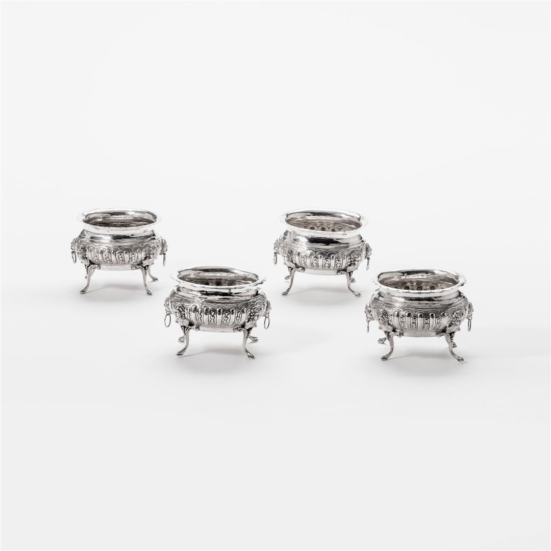 Two with the maker's mark of Johannes van Straten, Hoorn, 1894-1901, two with unclear marks Each oval salt is raised on four cabriole legs, the bombe sides are chased with flutes, masks and lion-and-ring handles. W. 9.2 cm Total weight approx. 902 g