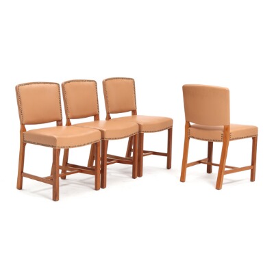 Four mahogany chairs, seat and back recently upholstered with light leather, fitted with brass nails. (4)
