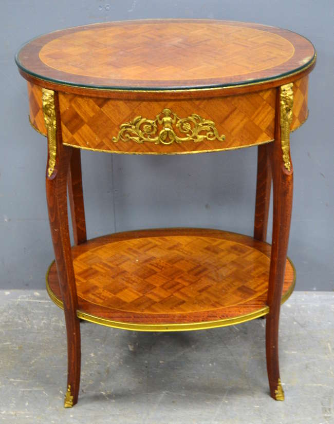 French style two tiered oval single drawer occasional table with gilt metal mounts