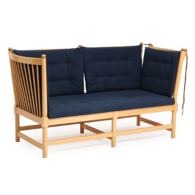 “The spoke-back sofa”. Two-seater sofa with beech frame, pull-out side and back with spokes, loose cushions in seat and back upholstered with dark blue wool. Model 1789. Designed 1945. Manufactured and marked by Fritz Hansen 1981. L. 160 cm.