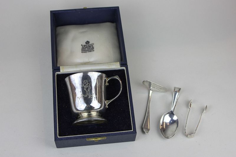 a silver pusher and spoon monogrammed, and Edwardian silver sugar tongs, 4.5oz