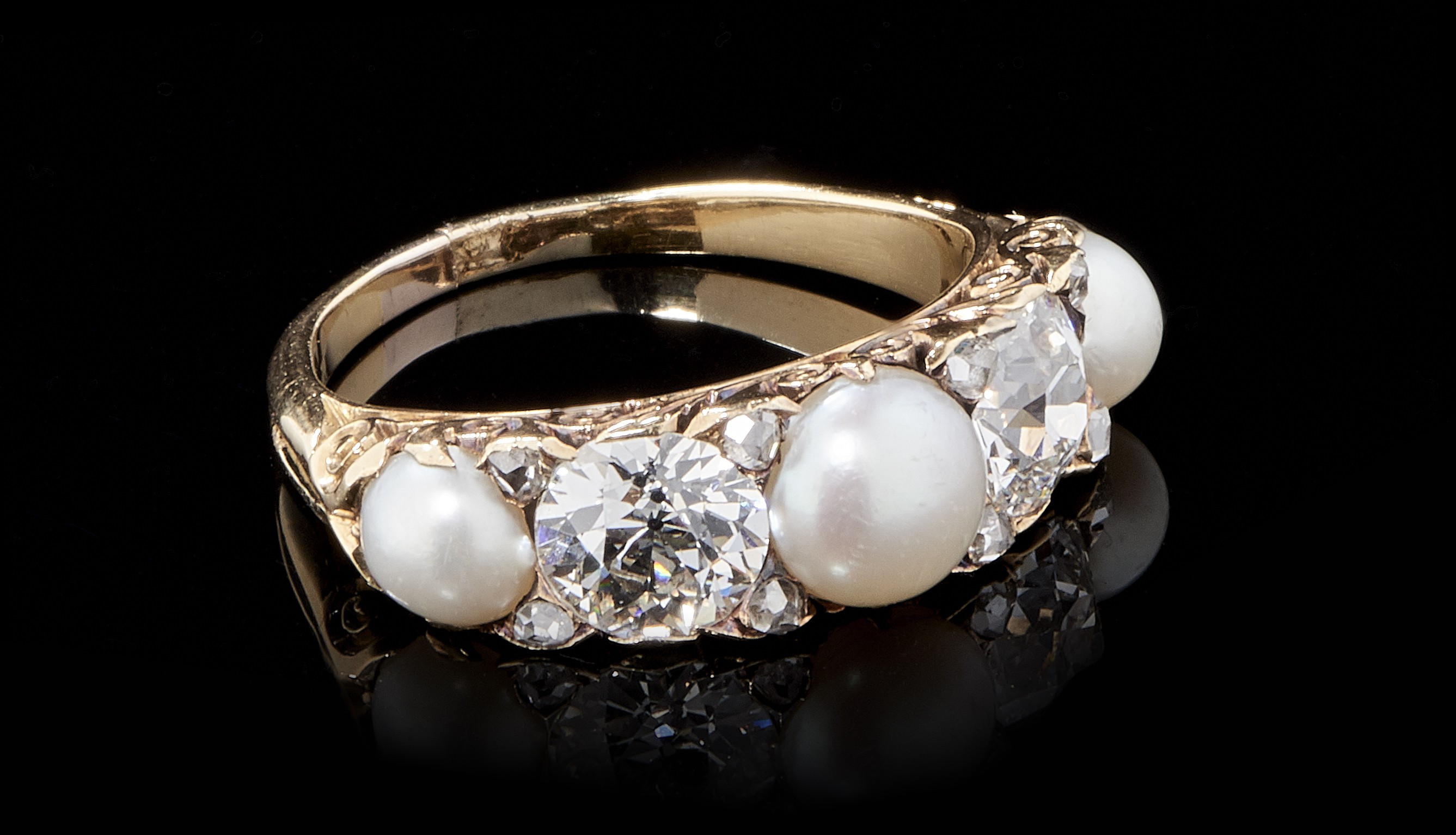 Garter ring set with two old cut diamonds (total approx 1.5 ct) alternate with three pearls