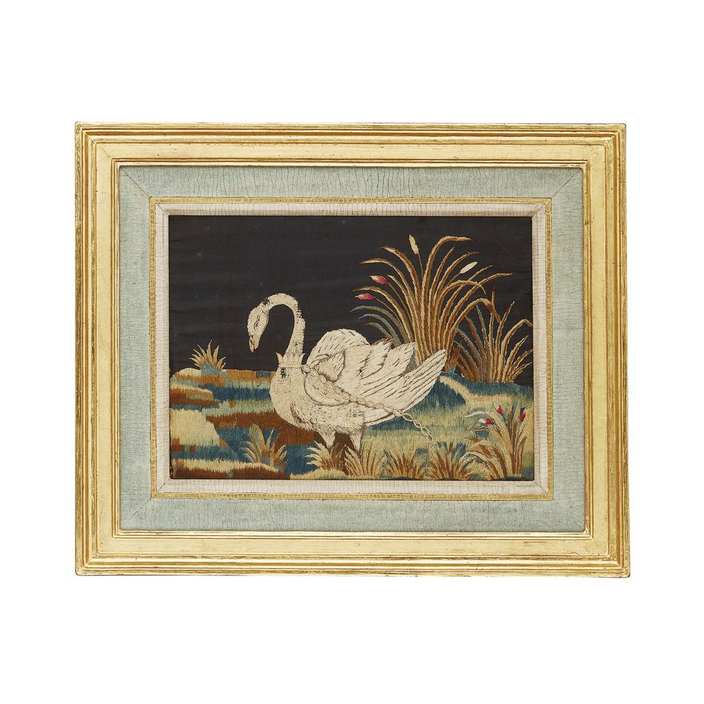 of rectangular form, depicting the 'Bohun swan' amongst reeds and grasses, with an old paper label to verso, in a glazed giltwood frame