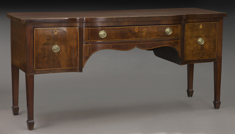 with string inlay and inlaid banding having a wide central drawer flanked by large square shaped drawers, one fitted for bottles and standing on four square tapered, spade foot legs. 38