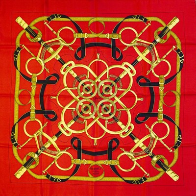 "Golden Spur", scarf with golden and black decoration on a red background