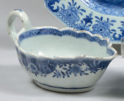 Gravy polylobée gripping handles white porcelain decorated in underglaze cobalt blue pagodas at the edge of a lively and volatil
