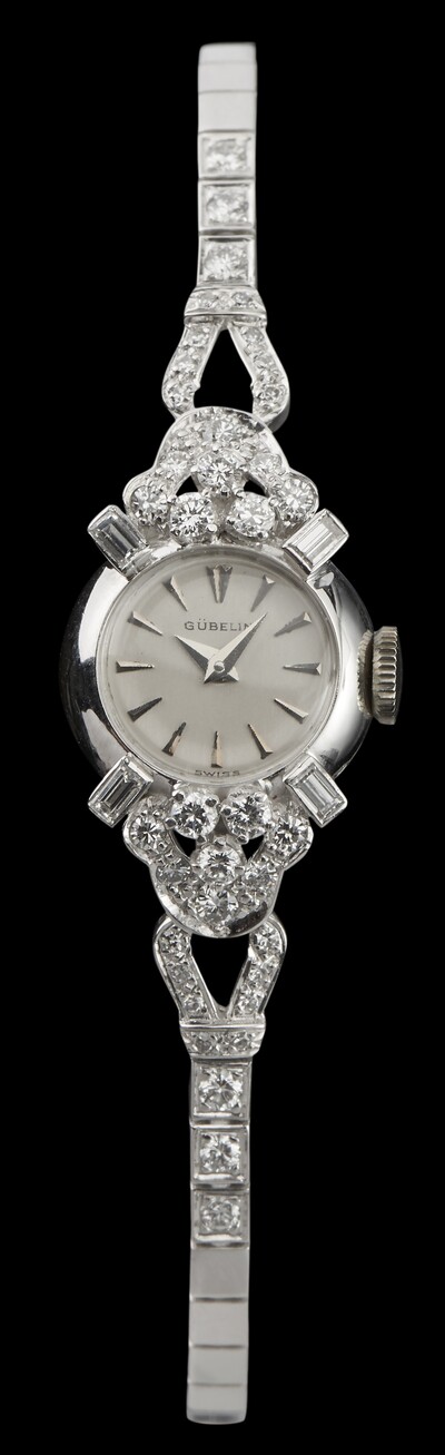 Gray dial, silver polished hour markers, 585 white gold, D 14 mm, W 17 cm, gross weight 18 g