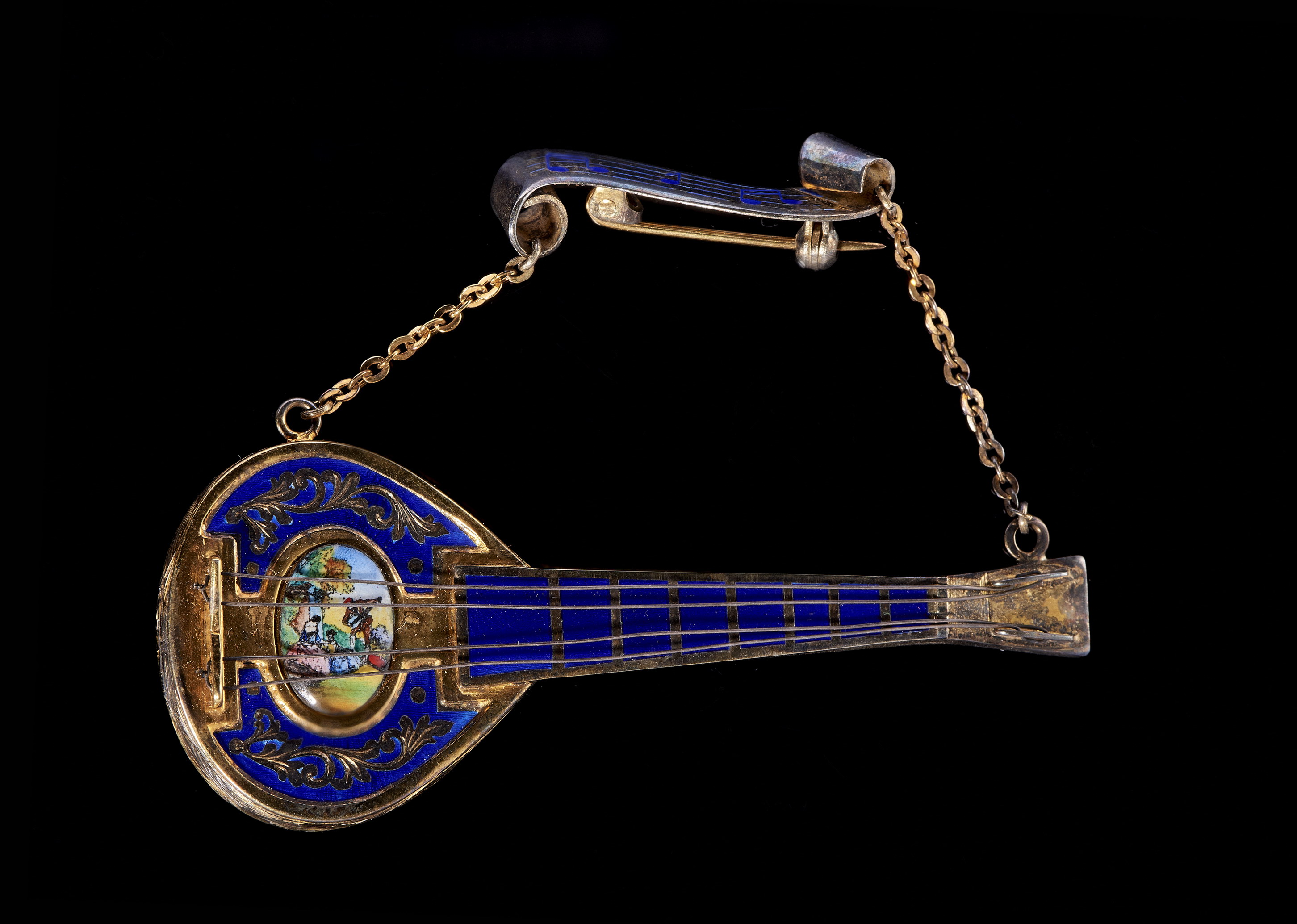 Guitar brooch-music box, Reuge, 20th century Golden silver and enamelled, 8x3 cm