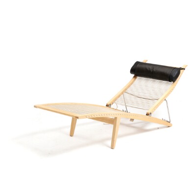 An ash deck chair, seat and back with flag halyard, adjustable back with chromed metal stretcher.