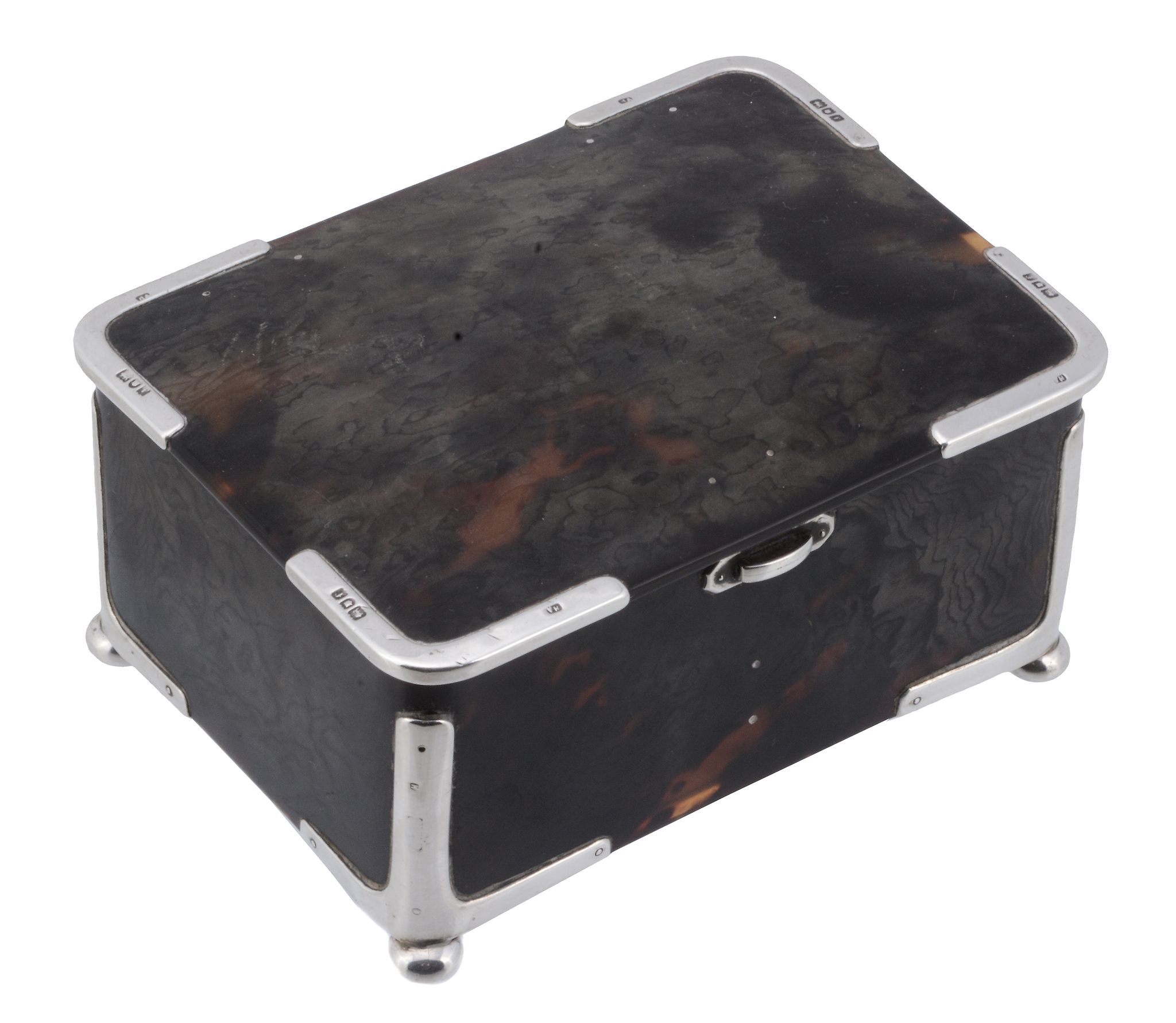 stamped for Thornhill & Co., New Bond Street as retailers, with plain silver angles, hinges, catch thumb piece and bun feet, 12cm (4 3/4in) long