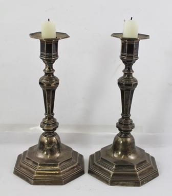 A PAIR OF CAST SILVER CANDLESTICKS IN THE 18TH CENTURY STYLE,