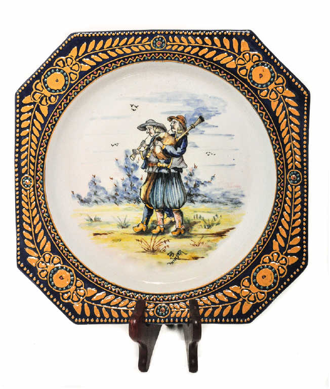 paire de plats en faïence polychrome, décor de couple de joueurs de binious, circa 1940, D. 29 cm (accidents à l'un)