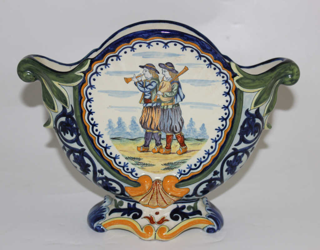 Jardinière à décor de deux sonneurs en faïence polychrome