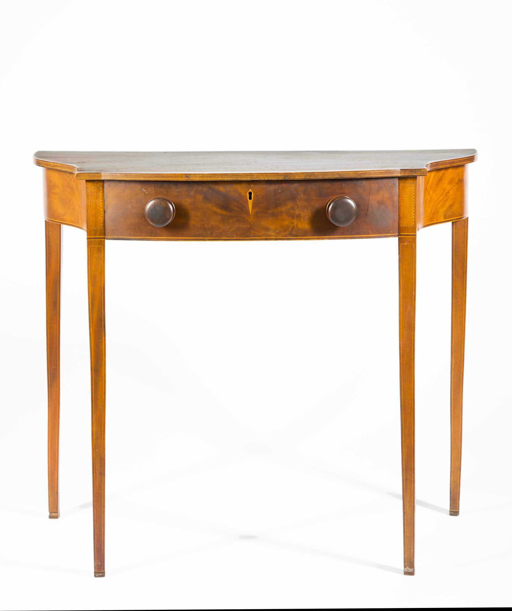 Serpentine front with single bowed fitted drawer supported by four line inlaid tapered legs with top inlaid panels, 36" wide X 31" tall, old refinished condition, feet appear to be reduced