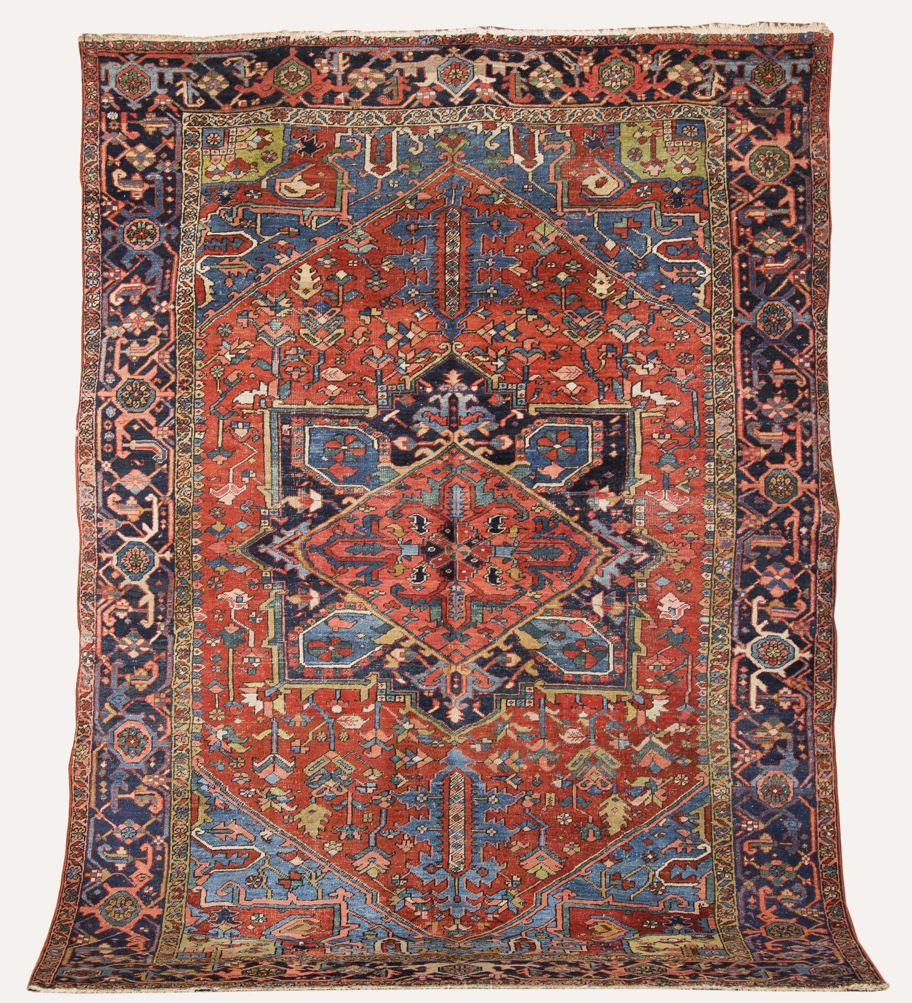 geometric center medallion on a brick red ground, cut corners and a blue geometric border, 10' 6" X 7" 10" wide, E20thC, some overall wear.