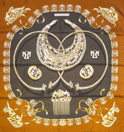 "Les cavaliers d'or", set of two scarves, one with gold motives on a brown and orange background and the other with gold motives on a green background Silk, 89x89 cm