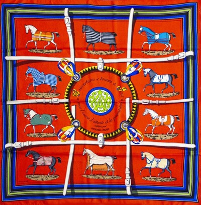 set of two scarves, one "Blankets and outfits" with a red background and the other "Vanquish" decorated with kepis and helmets on a cream background