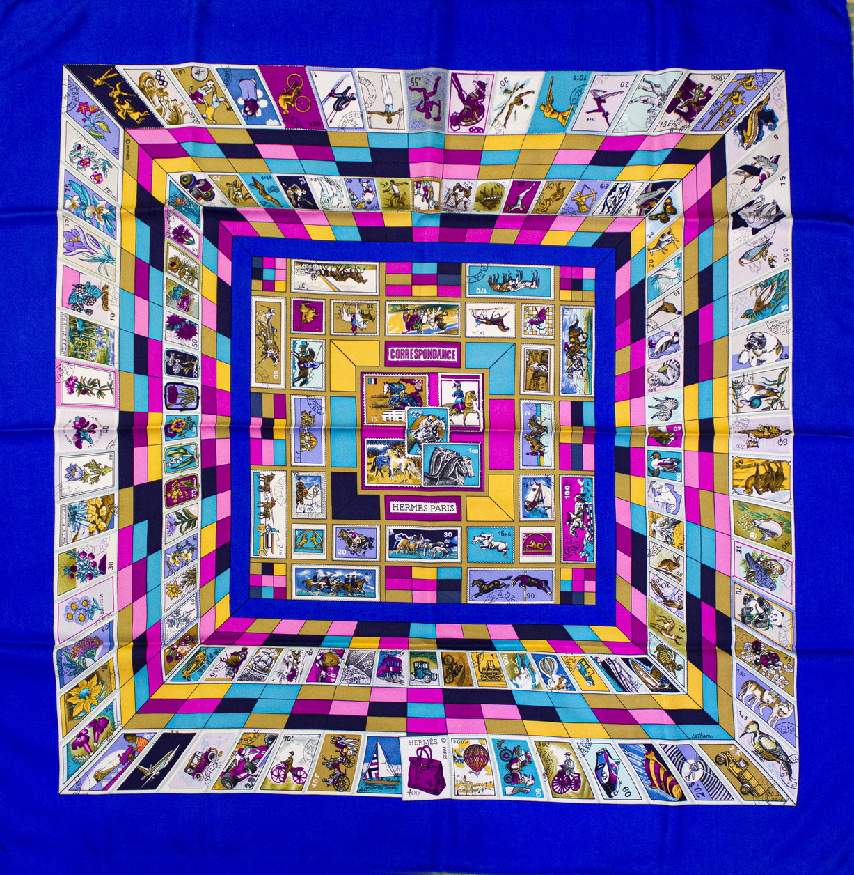 Hermes, set of two scarves, one "Correspondence" with stamp decoration on dark blue background and the other "Mors et Gourmettes" on dark blue background