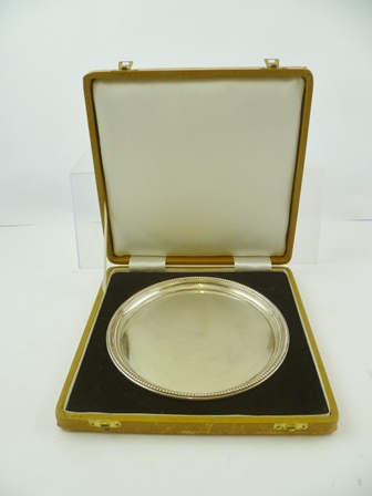 HISTORICAL HEIRLOOMS LTD. A SILVER WAITER/TRAY of plain circular form with bead applied wire edge, un-engraved, in period leather vending box, Birmingham 1974, 20cm diameter, 282g