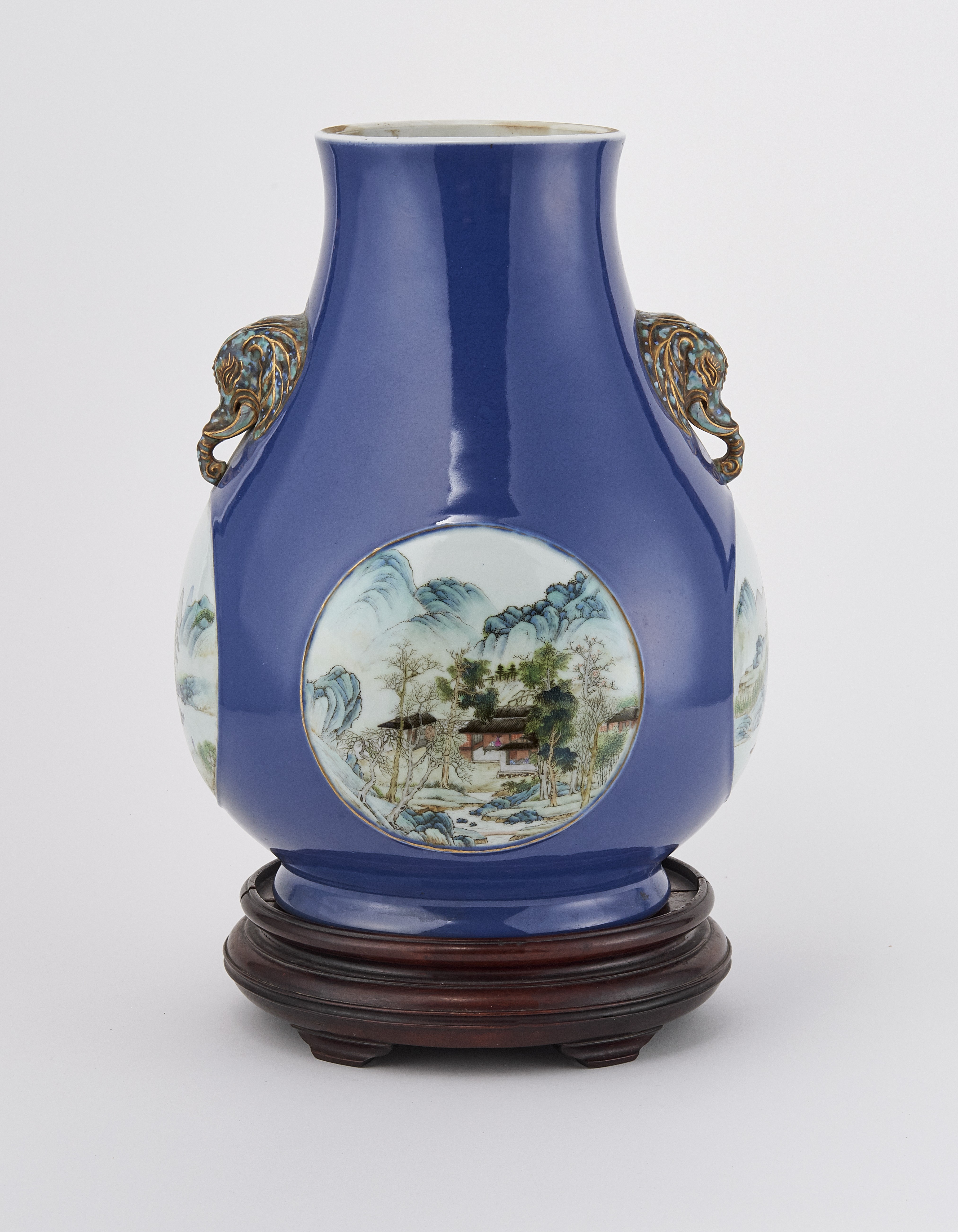 Porcelain enamelled polychrome four animated landscapes in reserve on blue background depicting the seasons