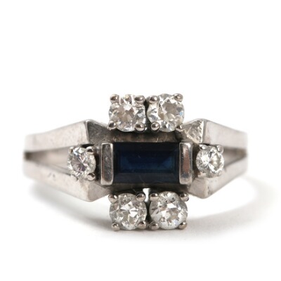 with a faceted sapphire encircled by six brilliant-cut diamonds, mounted in 14k white gold. Size 56. 1950–60's.