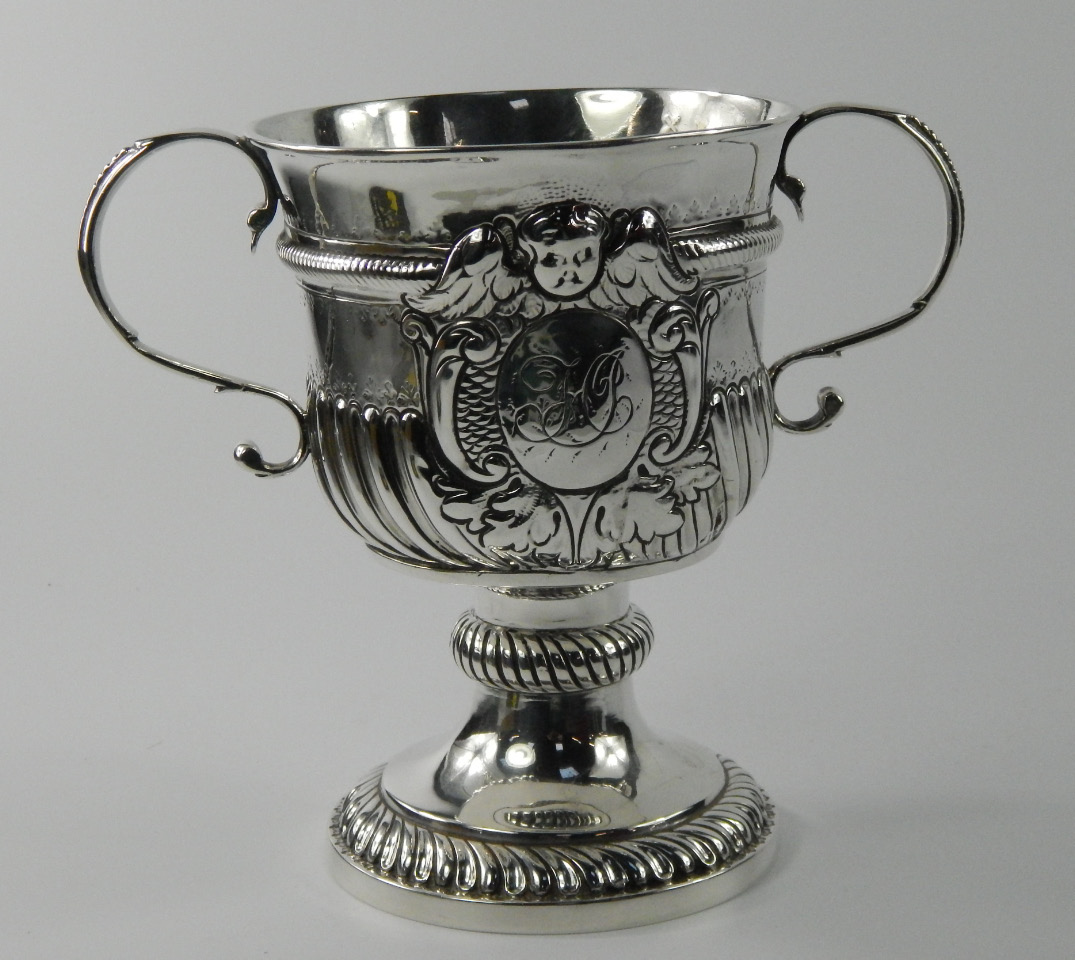 monogrammed to a cherub mask, scroll and acanthus cartouche, rope girdle and spirally fluted base, scroll handles, on a later knopped and gadrooned pedestal from a circular foot with conforming border, London Assay Office marks and cancellations for
