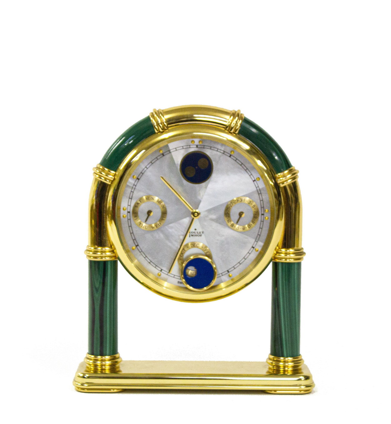 Mother-of-pearl dial, gold-plated hands and indexes, three dials for the month, day and date, malachite imitation plating, gilded metal, H 19.5 cm