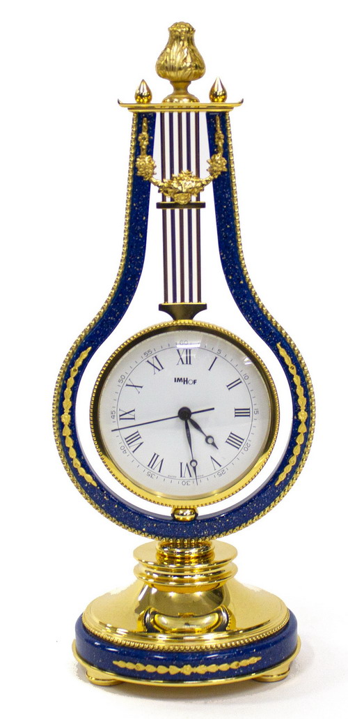 White dial, hands and black Roman numerals, plating imitation lapis lazuli, gold metal, H 27 cm, in its case