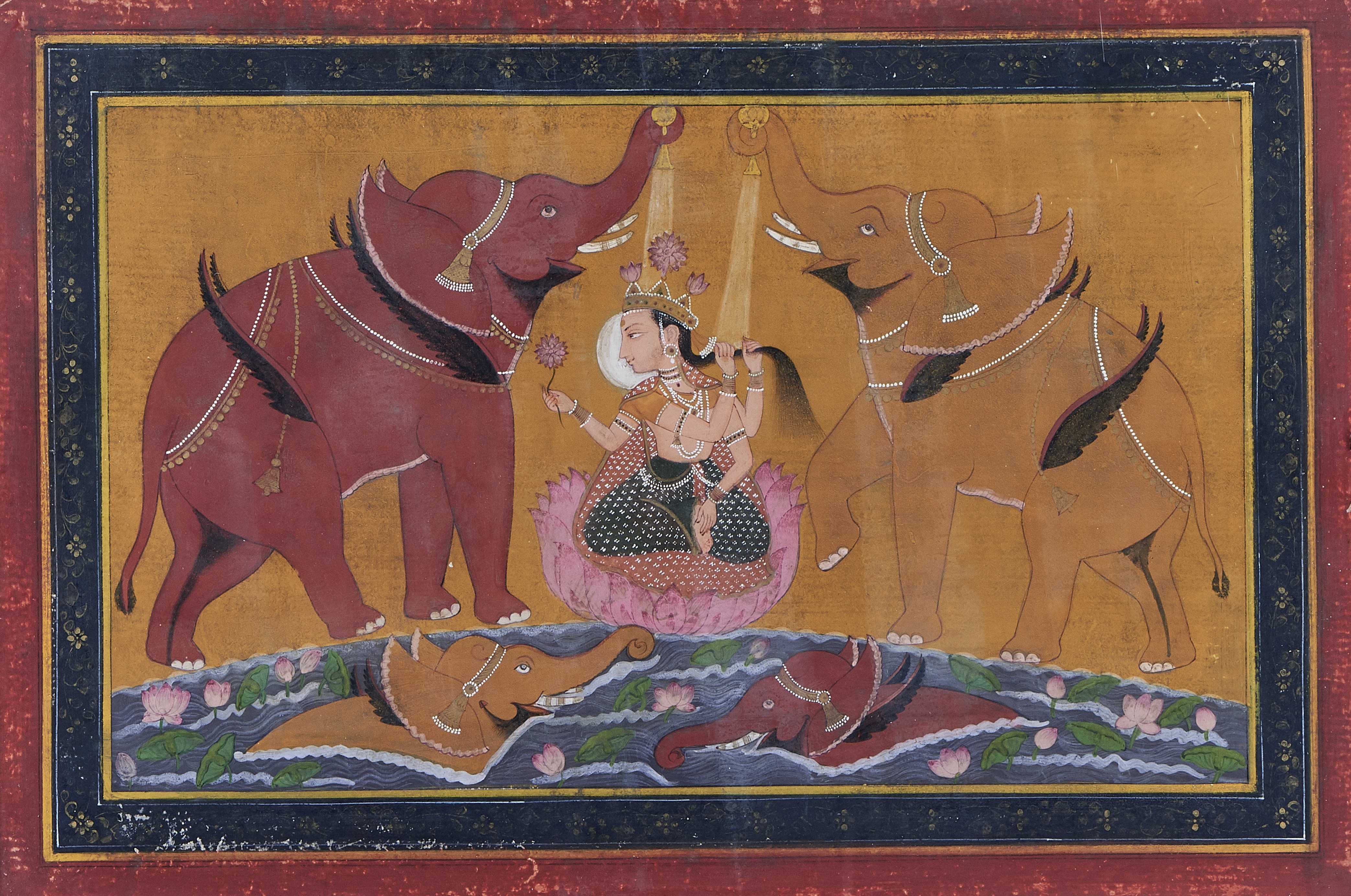 Miniature depicting a deity bathing with elephants, pigments on paper