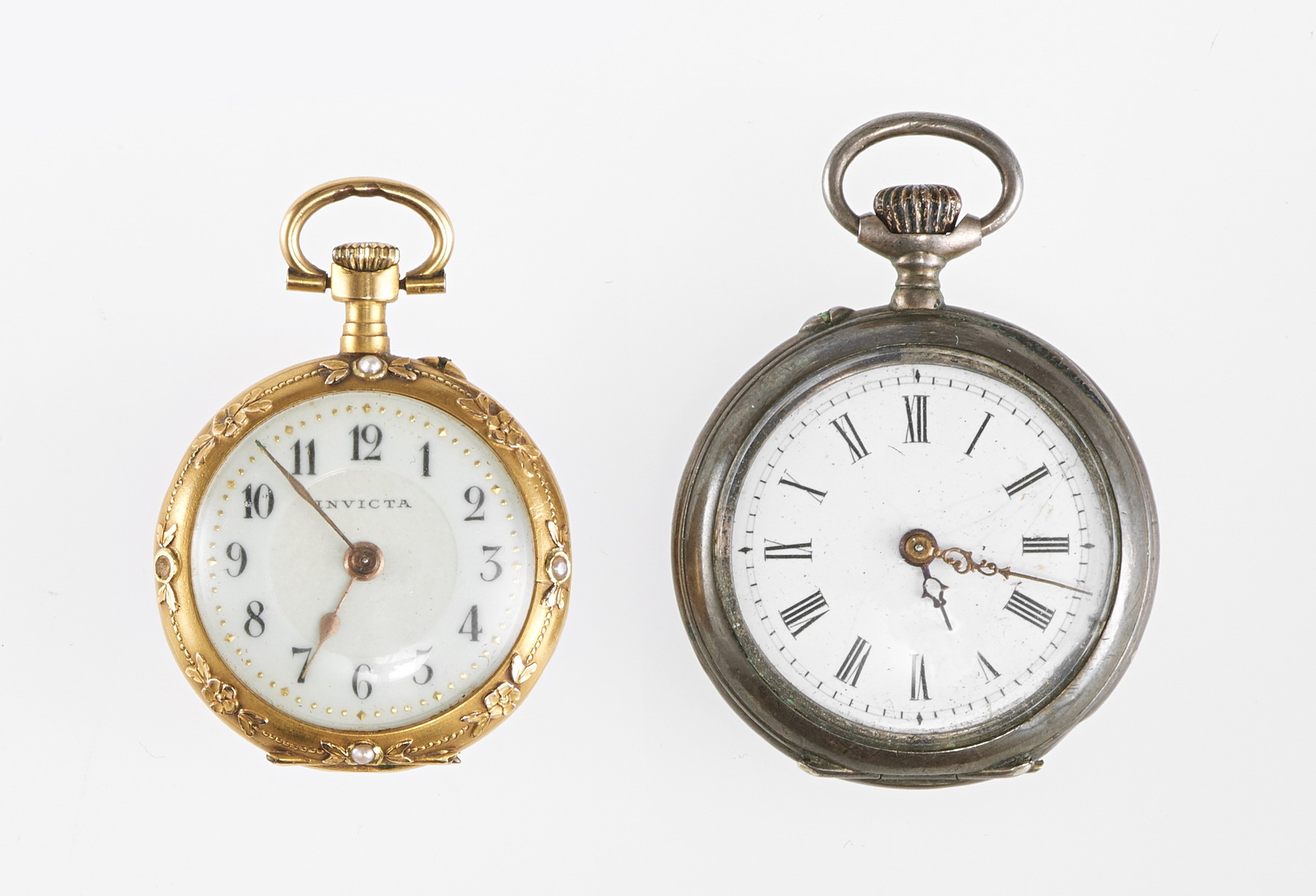 Cream dial, gold hands, black Arabic numerals, 750 gold, 25 mm D, 16 g raw weight. We attach a small silver pocket watch 800, D 30 mm.