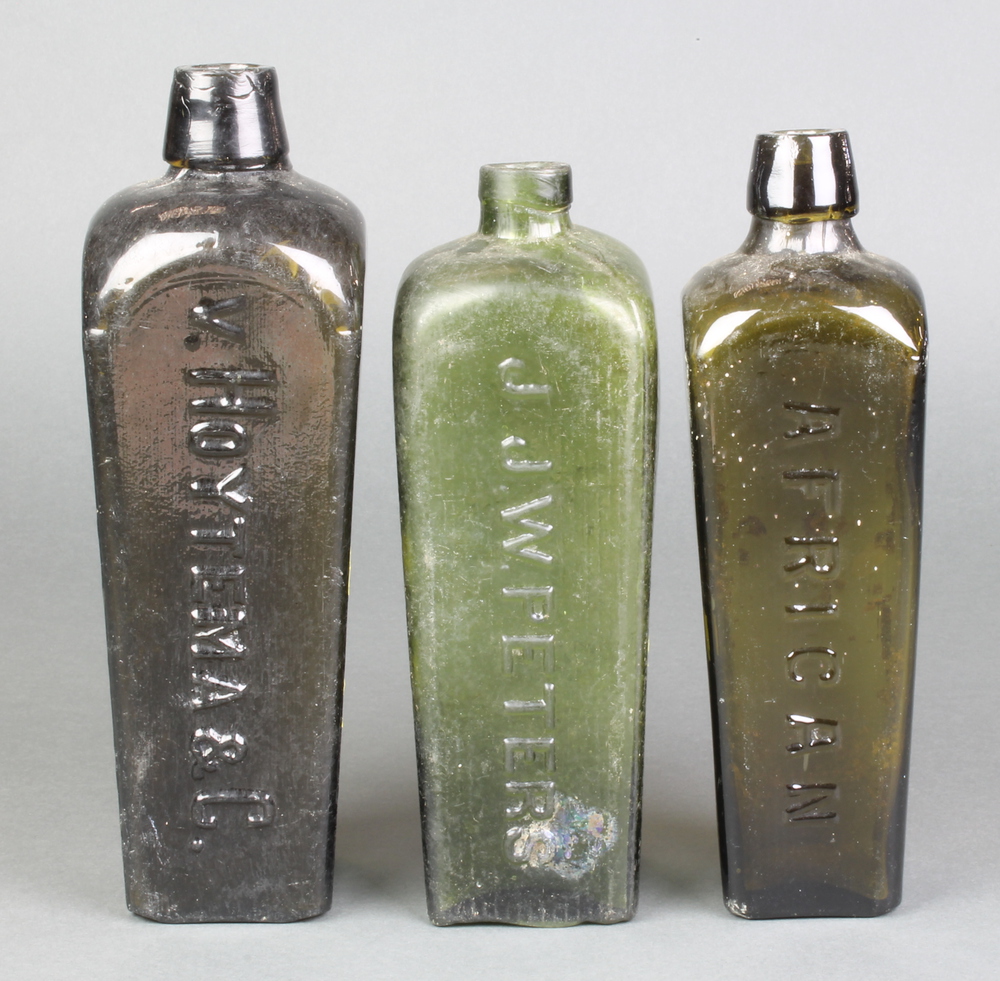 A J J W Peters green glass spirit bottle decorated a dog and marked Trade Mark, a green glass tapered spirit bottle stamped African 9" and a green glass spirit bottle marked V. Hoytema & Co