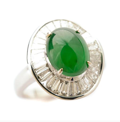 Centering one oval jadeite cabochon measuring approximately 9.30 x 7.49 mm, surrounded by thirty-two tapered baguette-cut diamonds weighing a total of approximately 1.00 cttw., set in an 18k white gold mounting. Accompanied by a GIA Gemological Repor