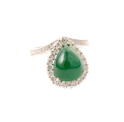 Centering one pear shaped jadeite cabochon measuring approximately 11.80 x 9.56 mm, surrounded by twenty full-cut diamonds weighing a total of approximately 0.75 cttw., accented by twelve full-cut diamonds weighing a total of approximately 0.05 cttw.