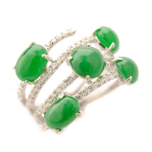 Featuring two oval and three round jadeite cabochons ranging in size from approximately 7.7 x 5.7 mm to 5.93 mm, accented by fifty-nine full-cut diamonds weighing a total of approximately 0.35 cttw., set in an 18k white gold mounting. Accompanied by