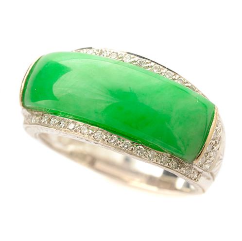 Centering an arc shaped jadeite segment measuring approximately 22.20 x 7.72 mm, accented by fifty round-cut diamonds weighing a total of approximately 0.25 cttw., set in an 18k white gold mounting. Accompanied by a GIA Gemological Report No. 1166646