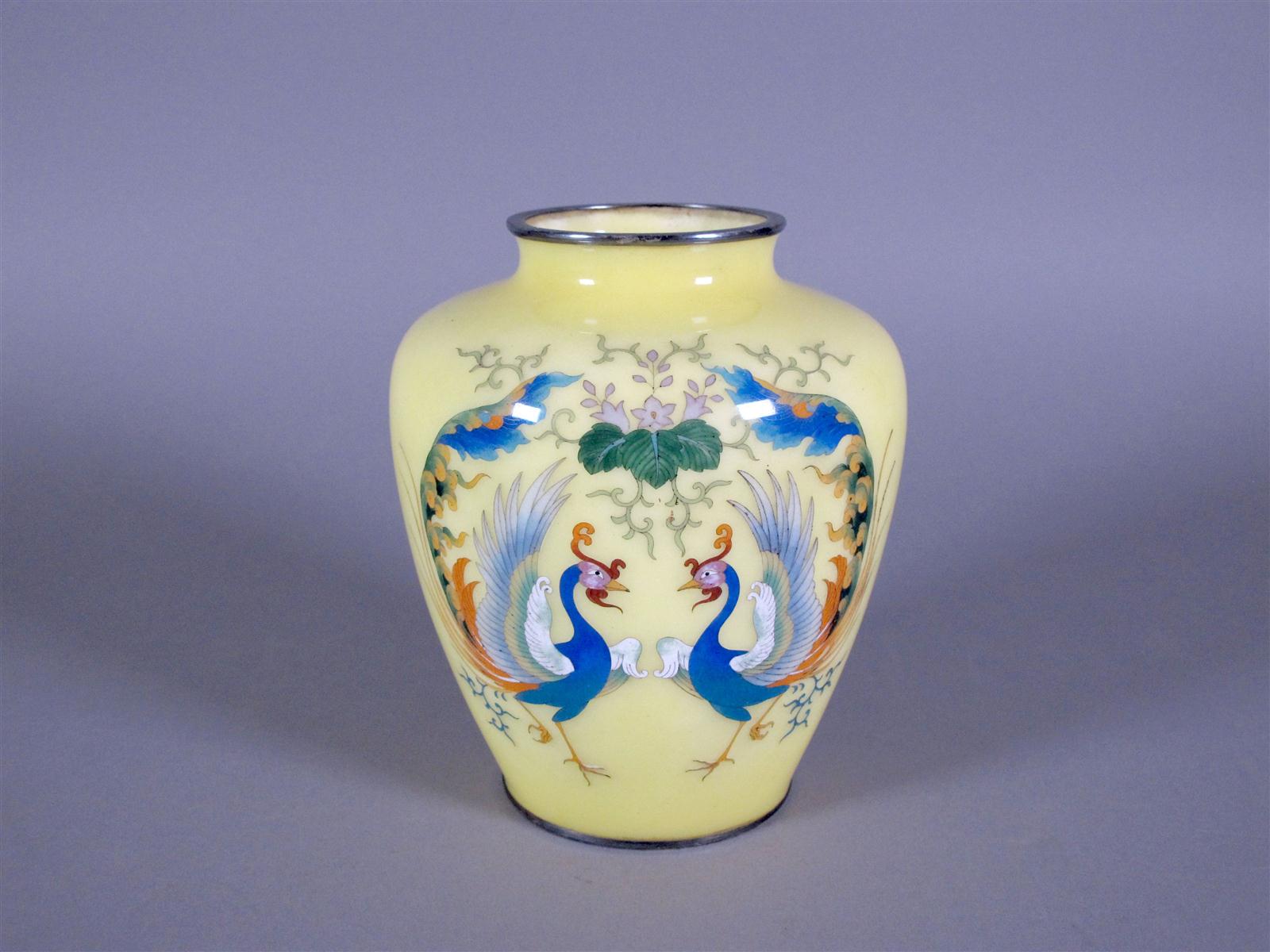 JAPAN enameled vase yellow silver, decorated with two phoenixes