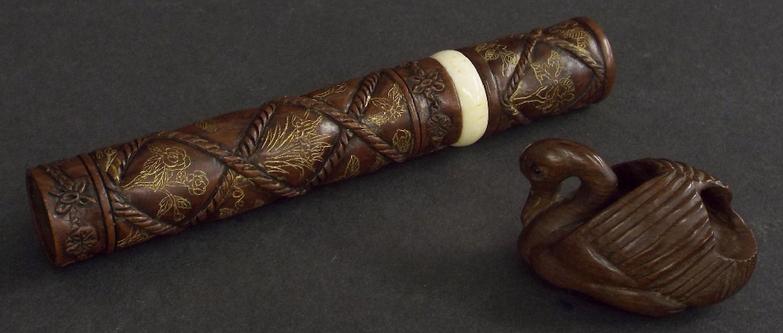 together with an interesting Japanese rosewood and ivory collared slim cylindrical vessel, the rosewood diaper panels with etched gilded foliate patterns, signed ivory seal mark, 4.5" long (2)