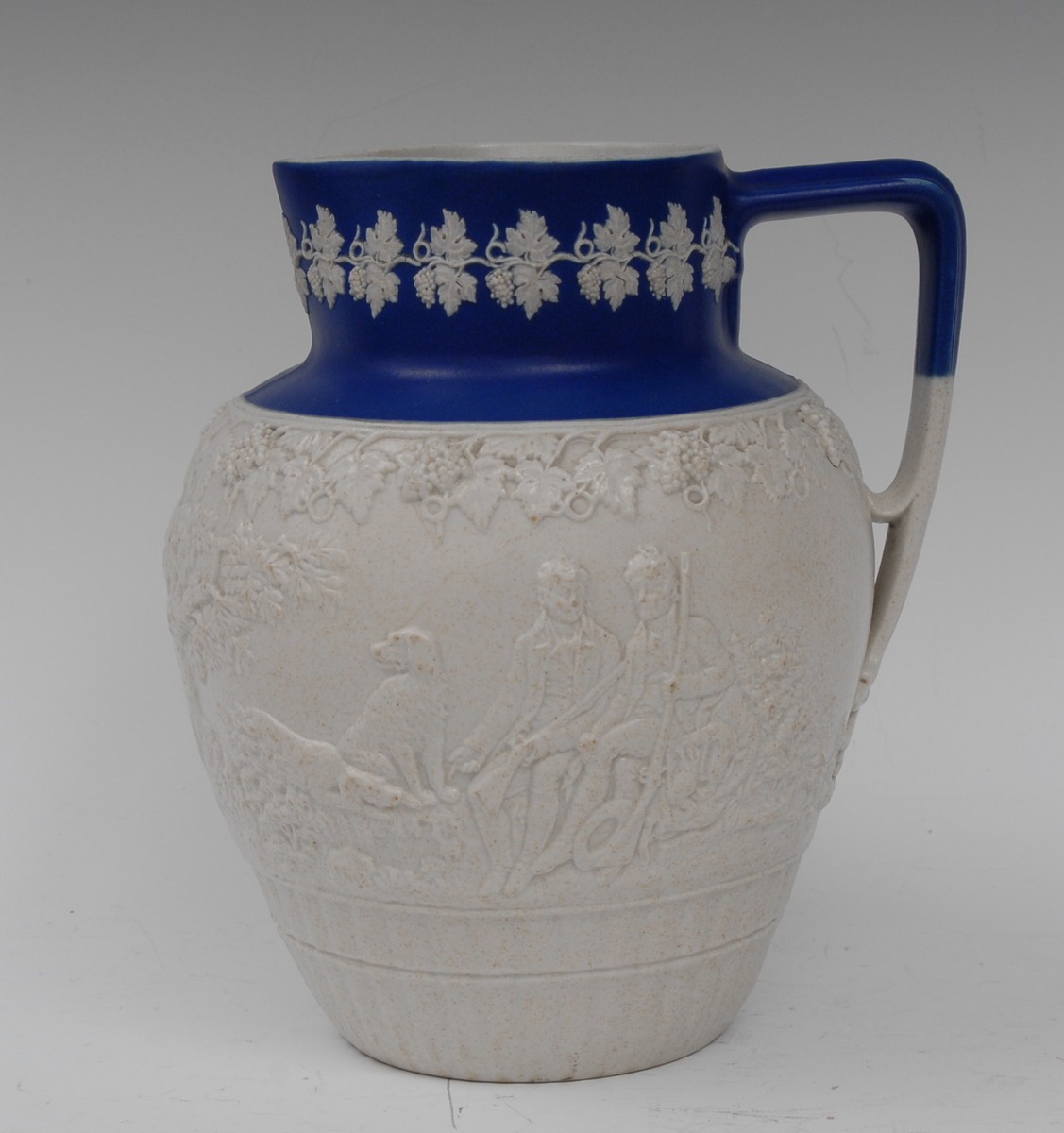 An early 19th century John Turner (Turner, Abbott & Co) stoneware jug, the white body decorated with low gentleman of sport with flintlock rifles, ... beaters and hounds, the upper band with fruiting vine, blue neck, 19cm high, impressed mark