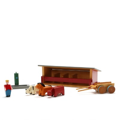 Various pieces of toys of painted wood. Comprising of barn, wagon, horse, two cows, water trough, farmer and farmer's wife. Some pieces stamped Kay Bojesen, Copyright, Denmark. H. 4–10 cm. (8)